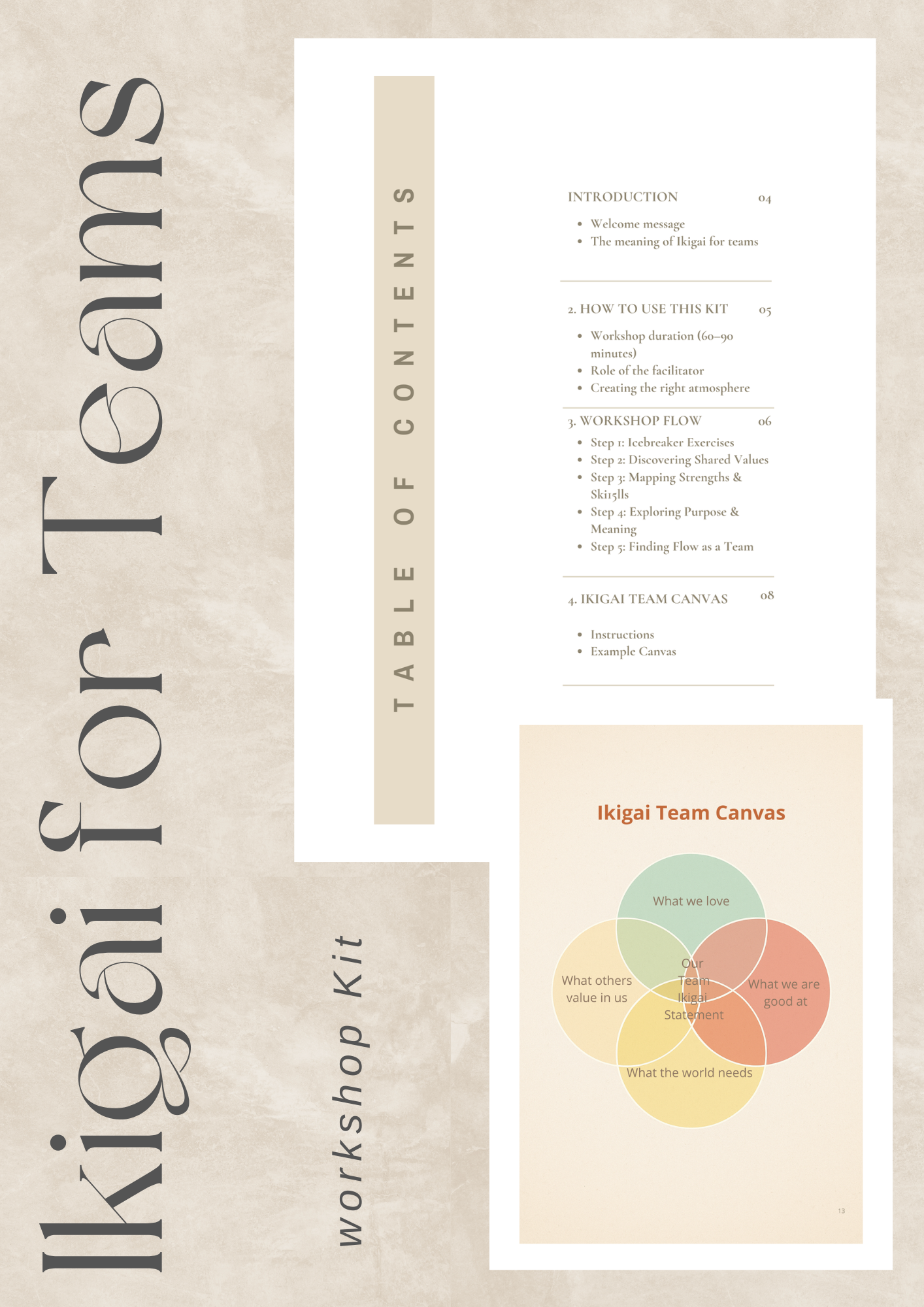 The Ikigai Team Workshop Kit is a ready-to-use digital toolkit that helps teams discover their shared values, strengths, purpose, and flow. Inspired by the Japanese concept of Ikigai — your reason for being — this workshop turns routine meetings into meaningful conversations.