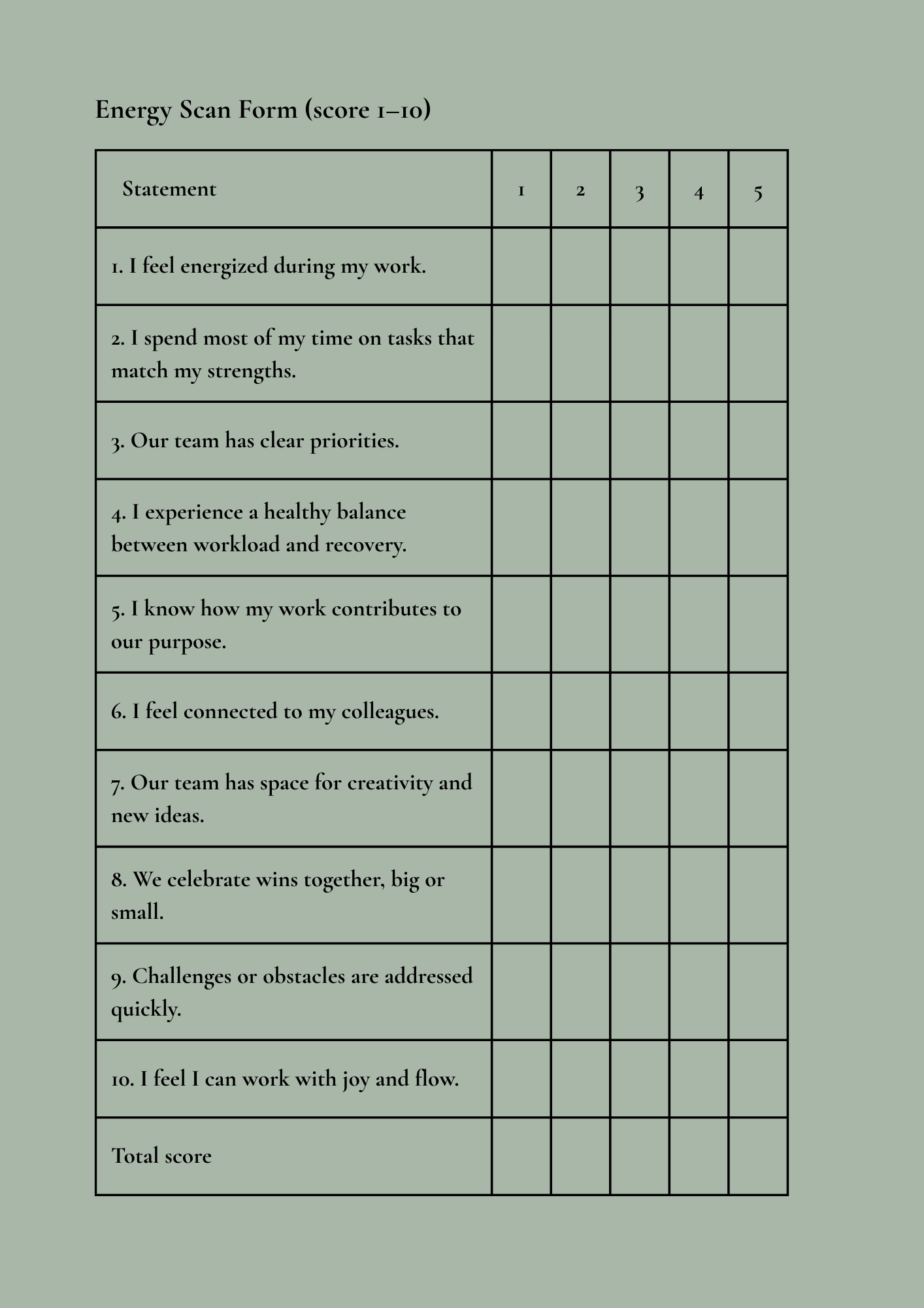 - Page 2: Energy Scan Form – 10 statements (score 1–10) to measure individual and team energy.