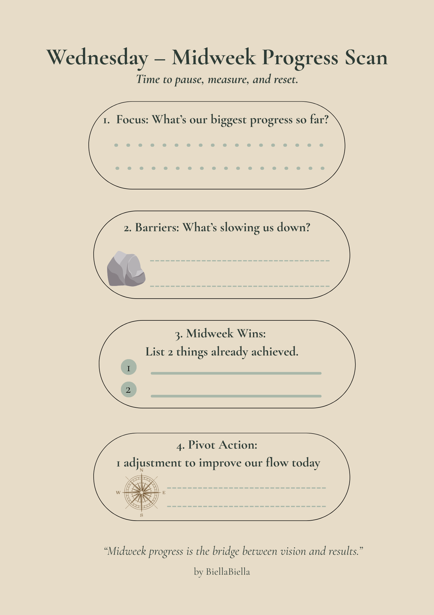 Practical prompts and check-ins to capture goals, energy, and teamwork.
